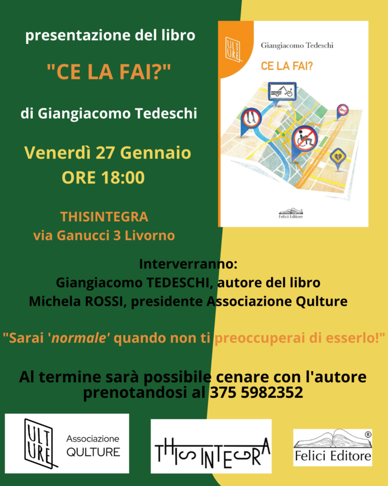 Venerdì 27 gennaio alle ore 18:00, presso i locali del Thisintegra di via Ganucci a Livorno, Giangiacomo Tedeschi, autore del romanzo Ce la fai? (Felici Editore, 2022) presenterà, con la sua consueta e profonda ironia, la storia di Marco