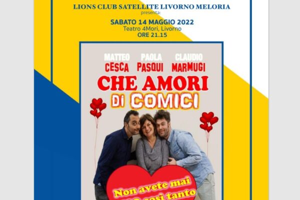 Il 14 maggio al Teatro 4 Mori di Livorno andrà in scena “Che amori di comici” uno spettacolo di Claudi Marmugi, Matteo Cesca e Paola Pasqui. Un appuntamento nato dalla volontà del Lions Club Satellite Livorno Meloria di sostenere la Lega Italiana Fibrosi Cistica Toscana odv, un’associazione formata da pazienti e loro famiglie che sostiene, tutela e difende i malati di fibrosi cistica.