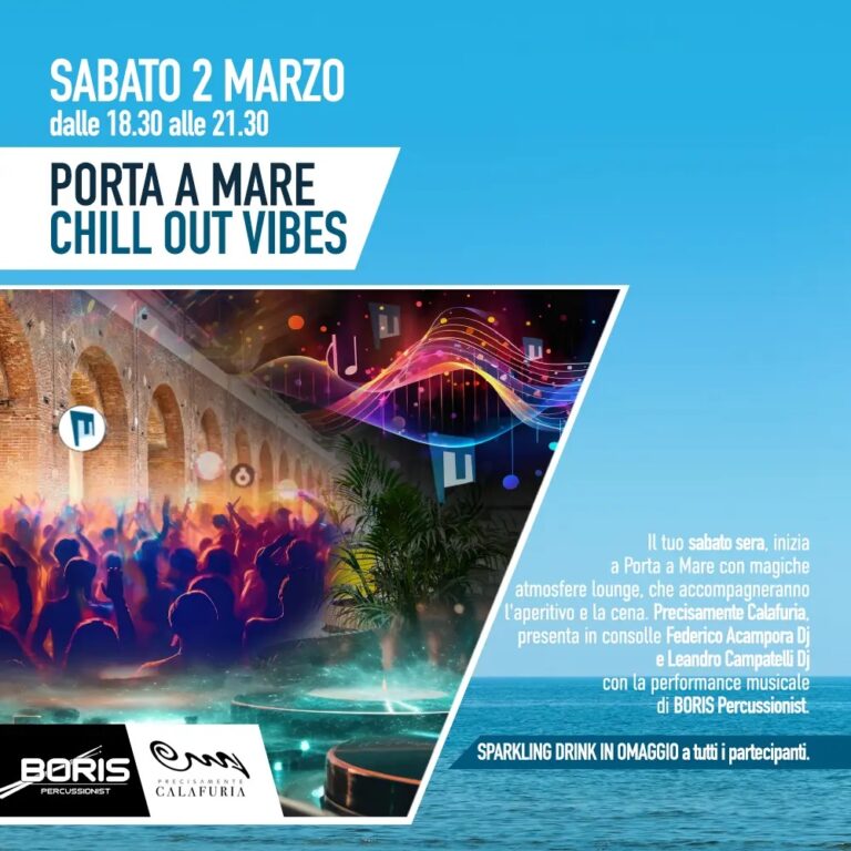 “Il tuo sabato sera, inizia a Porta a Mare”. Con questo slogan, Porta a Mare continua le proprie serate d’intrattenimento musicale all’interno delle Officine Storiche. Sabato 2 Marzo, dalle 18:30 alle 21:30, magiche atmosfere lounge accompagneranno i clienti durante l’aperitivo e la cena. La serata, organizzata in collaborazione con lo staff di Precisamente Calafuria, vedrà una selezione musicale a cura di Federico Acampora Dj e Leandro Campatelli Dj con la performance di Boris Percussionist. Per tutti i partecipanti, uno sparkling drink in omaggio. A Porta a Mare gli eventi non finiscono mai. Il Calendario 2024 è in continua evoluzione. Tutte le iniziative vi aspettano sul sito, i canali social e la newsletter di Porta a Mare. Tutti gli eventi sono gratuiti, ad ingresso libero.