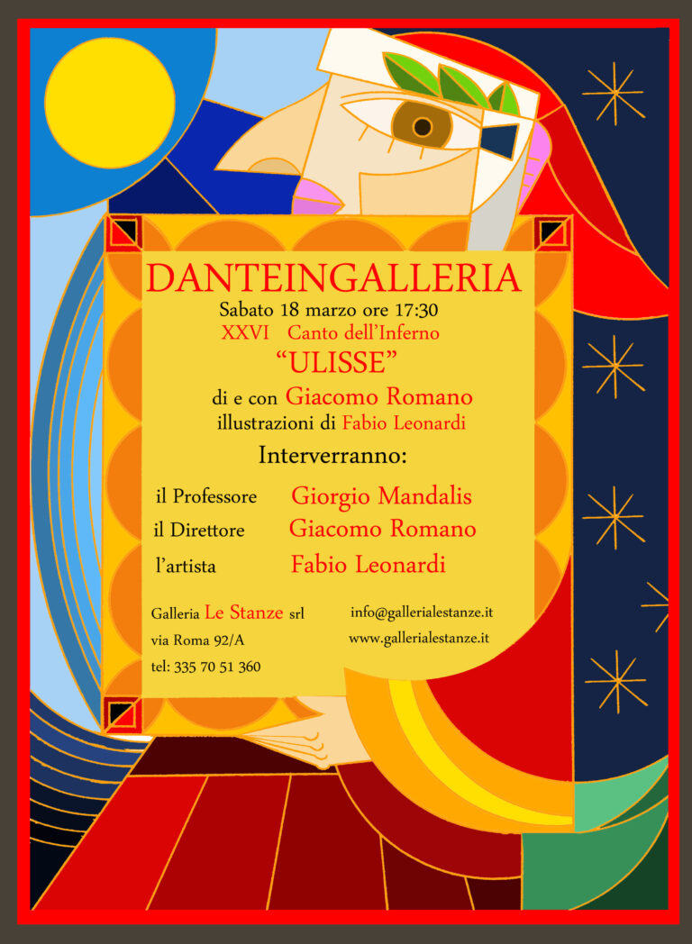 In questo secondo incontro del 2023, Giacomo Romano leggerà uno dei Canti più conosciuti ed amati, il Canto XXVI dell’Inferno – Ulisse-; partecipano al pomeriggio l’artista Fabio Leonardi che ha ideato per questo Canto quattro opere a stampa digitale ed il professor Giorgio Mandalis che ci parlerà della Commedia.