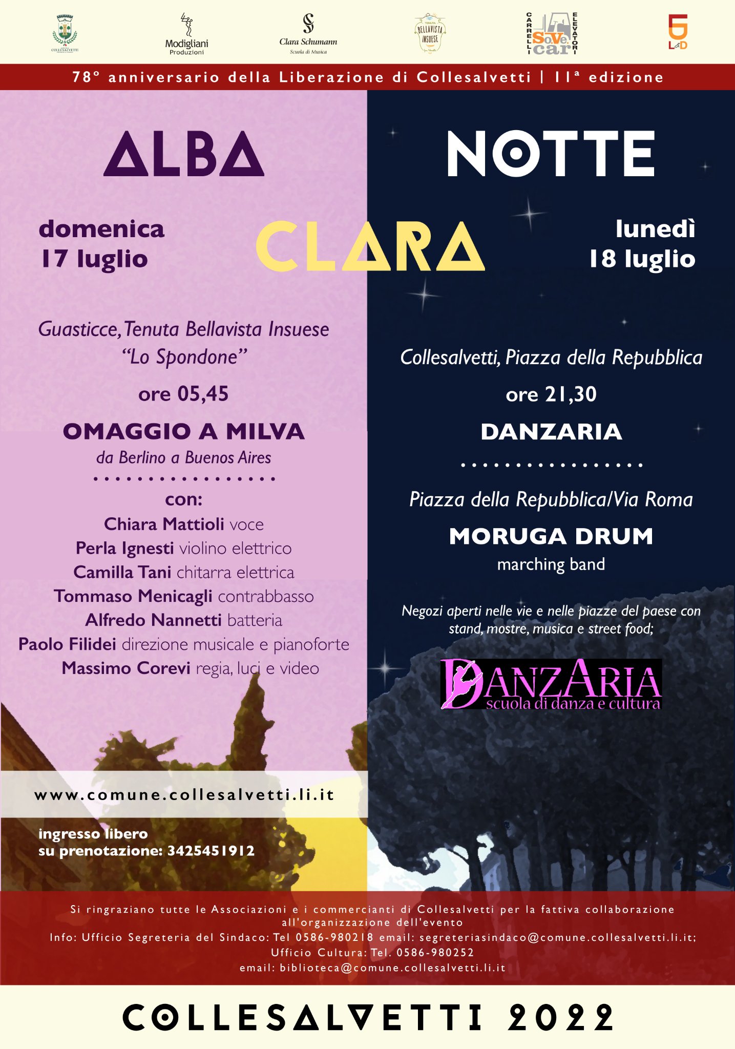 “E la notte si fece luminosa…chiara”. Sono queste le parole utilizzate da chi ha vissuto in prima linea gli orrori della guerra e che di quel 18 luglio 1944, giorno in cui Collesalvetti fu liberata dal nazifascismo, conserva ricordi ancora nitidi. “Notte Clara” ed “Alba Clara”, sono nate così, dal desiderio di tener viva quella memoria che ha, al centro, la libertà, valore fondamentale ed imprescindibile. Appuntamento dunque, domenica 17 e lunedì 18 luglio, con una due giorni all’insegna della cultura, del buon cibo e del divertimento tra stand, mostre e spettacoli che coloreranno non solo le vie del centro di Collesalvetti ma, anche, la Tenuta Bellavista Insuese. “A tre anni dall’ultima edizione di “Notte Clara” – hanno spiegato le Assessore Mascia Vannozzi e Sara Paoli – l’Amministrazione Comunale ha voluto dare un segnale importante alla comunità: la pandemia ha limitato la nostra libertà e, oggi più che mai, abbiamo bisogno di ritrovare quegli spazi in cui ad essere protagonista è la condivisione”.