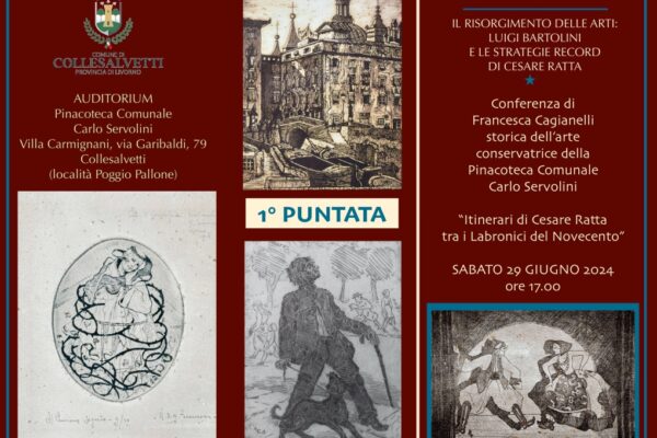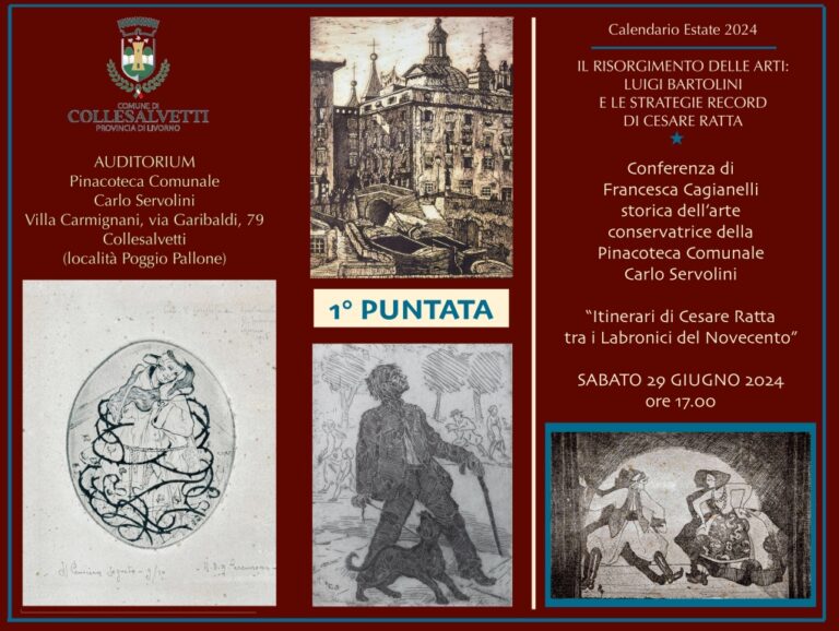 L’Amministrazione Comunale di Collesalvetti ha l’onore di varare il prestigioso Calendario Estate 2024, dal titolo “Il Risorgimento delle Arti. Luigi Bartolini e le strategie record di Cesare Ratta”, promosso e realizzato dal Comune di Collesalvetti, ideato e curato da Francesca Cagianelli, in occasione dell’importante mostra “Luigi Bartolini e gli acquafortisti italiani al tempo di Cesare Ratta”, promossa e organizzata dal Comune di Collesalvetti, ideata e curata da Francesca Cagianelli e Paolo Bassano (Villa Carmignani, via Garibaldi, 79 – Collesalvetti, località Poggio Pallone / orari: tutti i giovedì, ore 15.30- tutti i giovedì, ore 15.30-18.30; sabato 1 giugno / domenica 2 giugno; Sabato 8 giugno / Domenica 9 giugno; Sabato 15 giugno / Domenica 16 giugno / sabato 21 settembre / domenica 22 settembre, ore 15.30-18.30 / su prenotazione per piccoli gruppi (minimo 6 persone); visite guidate gratuite su prenotazione / info: 0586 980251; [email protected]; www.comune.collesalvetti.li.it).