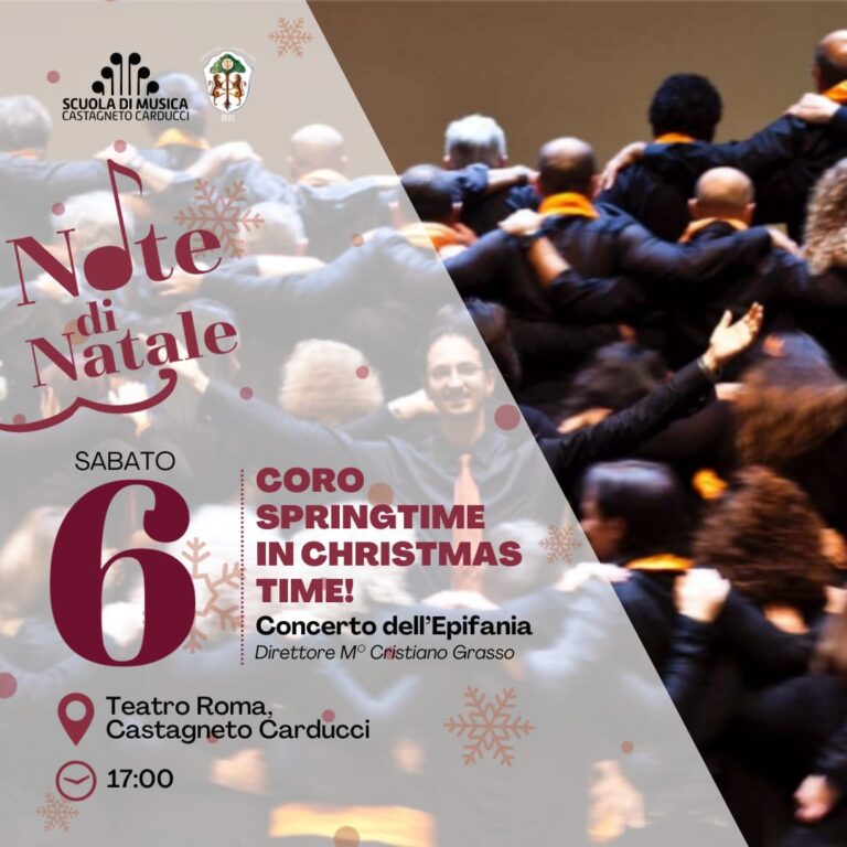 Tradizionale Concerto dell’Epifania che si terrà domani sabato 6 gennaio alle ore 17.00 al Teatro Roma a Castagneto Carducci. Si esibirà il Coro SpringTime in Christmas Time! diretto dal maestro Cristiano Grasso. Ingresso libero e gratuito.
