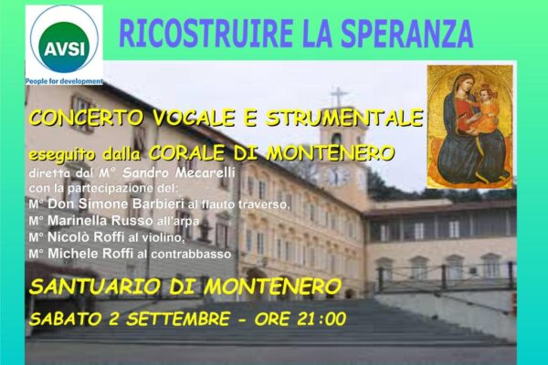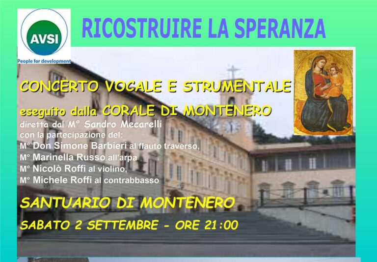 Nel 2017 AVSI é stata presente in Siria il progetto “Ospedali Aperti” per aiutare il popolo siriano durante la guerra. Oggi dopo il Covid, il colera ed il terremoto vuole aiutare questo popolo così martoriato attraverso un concerto vocale e strumentale che si svolgerà sabato 2 settembre alle 21 al Santuario di Montenero, sotto la direzione del M° Sandro Mecarelli con la partecipazione del M° Don Simone Barbieri al flauto traverso, del M° Marinella Russo all’arpa, del M° Nicolò Roffi al violino, e del M° Michele Roffi al contrabbasso.