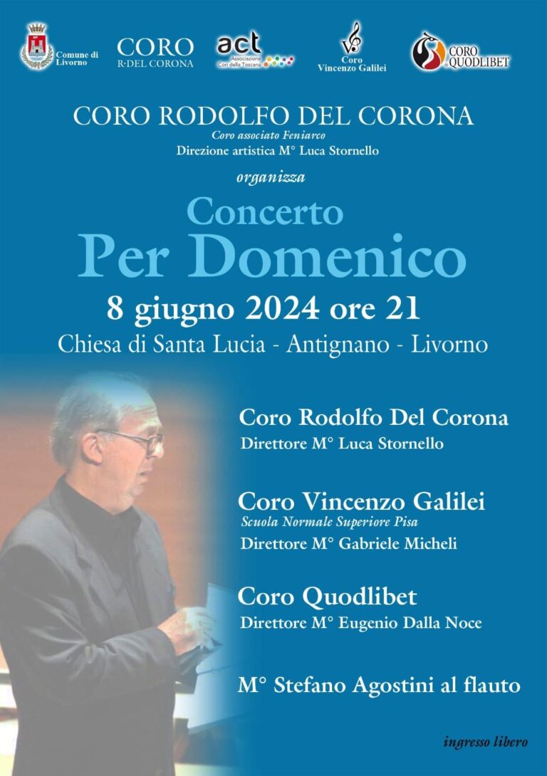 Come ogni anno il Coro Rodolfo Del Corona organizza, sotto la direzione artistica del M° Luca Stornello, un evento nel suo ricordo: per questa edizione il Concerto per Domenico – che si terrà sabato 8 giugno alle ore 21 presso la nuova Chiesa di Santa Lucia in via Urano Sarti 89 – con il patrocinio del Comune di Livorno, diventa un incontro di cori e strumentisti, che vedrà la presenza del Coro Quodlibet di San Casciano diretto dal M° Eugenio Dalla Noce, del Coro Vincenzo Galilei della Scuola Normale Superiore di Pisa diretto dal M° Gabriele Micheli.
