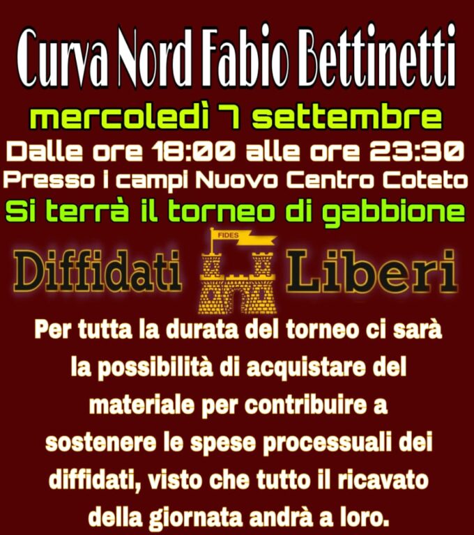 Mercoledì 7 settembre si svolgerà, al campo del Nuovo Centro di Coteto, il primo torneo di gabbione per i diffidati della Curva Nord. L’evento si svilupperà dalle 18 in poi e avrà lo scopo di raccogliere fondi per garantire una degna difesa legale a tutti coloro che sono implicati nelle varie vicende legate ai provvedimenti emanati sui tifosi amaranto.