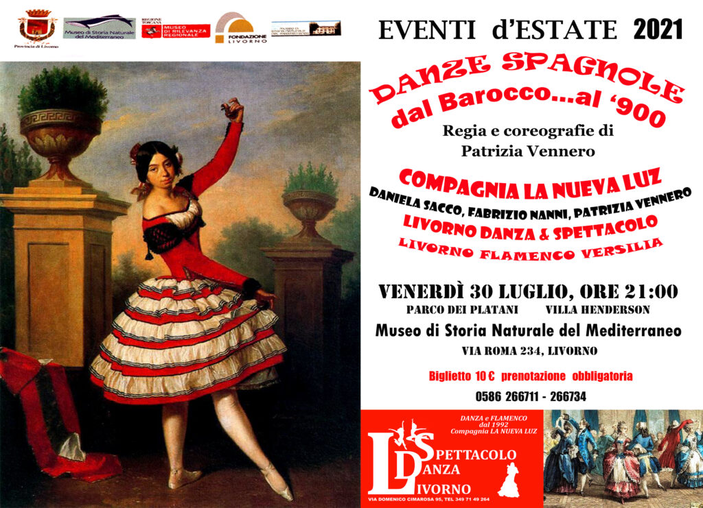 “Danze Spagnole: dal Barocco al ‘900”, con la regia e coreografie di Patrizia Vennero. Spettacolo di danza spagnola Cia La Nuova Luz con Daniela Sacco, Fabrizio Nanni, Patrizia Vennero e con Il corpo di ballo di A.S.D Livorno Danza & Spettacolo e Livorno Flamenco Versilia: Tina Chieffo, Laura Fontanive, Lara Giocondo, Laura Lombardo, Annalisa Longo, Anna Mangiaracina. Un omaggio alla più bella musica classica spagnola, con gli storici brani dal 1700 al ‘900. Dal Fandango di Luigi Boccherini a Manuel de Falla, volteggiando tra le note di Sarasate, Malats e la Zarzuela di Amadeo Vives, finalizzando con una impetuosa danza su fantasie da Carmen di Bizet. L’appuntamento è venerdì 30 luglio al Museo di Storia Naturale del Mediterraneo, nel fresco e accogliente giardino dei Platani di Villa Henderson alle 21, in via Roma 234 a Livorno.