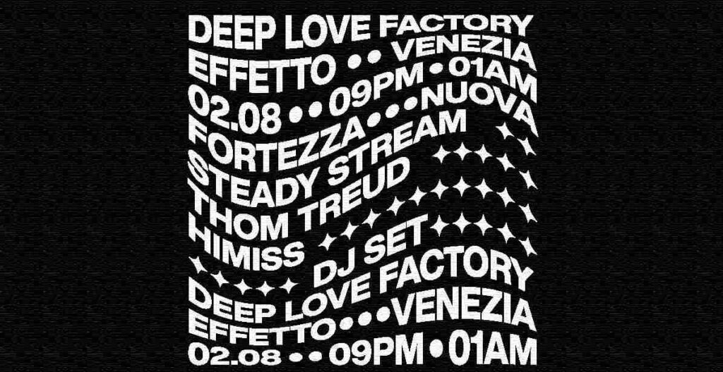 Deep Love Factory replica il successo dell’anno passato per Effetto Venezia con tre dj set sul palco grande di Fortezza Nuova. Mercoledì 2 agosto, dalle 21 si alterneranno le consolle di Steady Stream, Thom Treud, Himiss