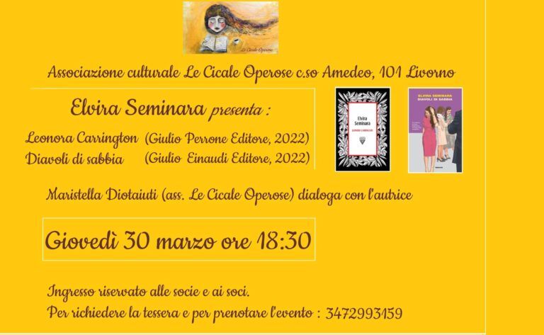 Giovedì 30 marzo alle 18,30 Elvira Seminara presenta alle Cicale Operose di corso Amedeo 101,  Diavoli di sabbia (Giulio Einaudi Editore, 2022); Leonora Carrington (Giulio Perrone Editore, 2022). Maristella (associazione Le Cicale Operose) dialoga con l’autrice