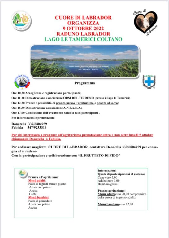 Domenica 9 ottobre, a partire dalle 10,30 del mattino, all’Agriturismo Lago le Tamerici a Pisa si svolgerà il 2o° raduno Cuore di Labrador.