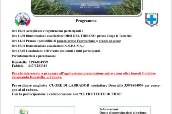 Alle 11,30 si terrà una dimostrazione da parte dell’associazione della scuola di salvataggio Orsi del Tirreno. Un’ora più tardi, alle 12,30, il pranzo in agriturismo o, per chi preferisse, al sacco e alle 15,30 dimostrazione Anpana dove verrà spiegato tutto quello che viene fatto per la protezione animali e per la tutela dell’ambiente.