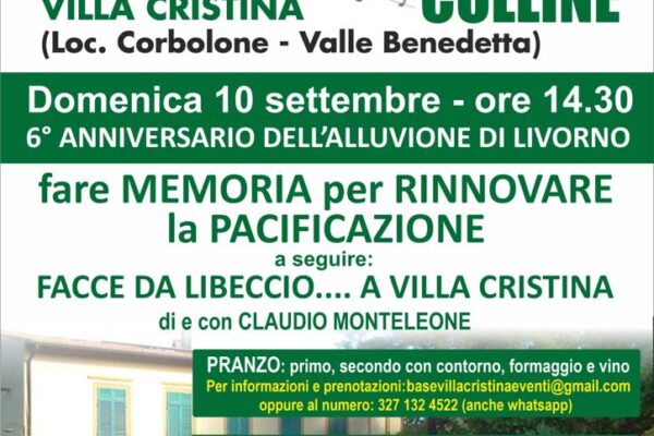 Dopo pranzo ci sarà un momento in cui fare memoria dell’alluvione (alle ore 14,30) e, a seguire, una pièce teatrale dell’attore livornese Claudio Monteleone (“Facce da libeccio… a Villa Cristina”). Sarà possibile anche degustare birra e vino.