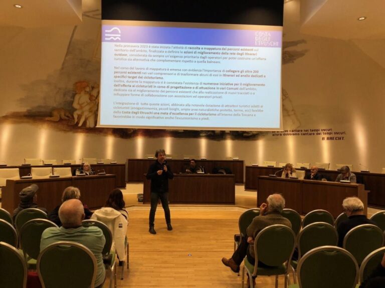 Con questa convinzione l’Ambito turistico Costa degli Etruschi, che riunisce 15 Comuni, ha organizzato la presentazione del progetto “GT Costa degli Etruschi” ad amministratori e operatori dei Comuni costieri (Rosignano Marittimo, Cecina, Castagneto Carducci e Bibbona). Così nel pomeriggio del 13 febbraio, al palazzetto dei congressi di Cecina l’Ambito, il coordinatore dell’Ambito, Marco Pavoletti, ha illustrato quella che vuole essere una rivoluzione per il turismo locale e dell’intera regione. “Uno dei nostri obiettivi – ha detto – è far conoscere la costa non solo per il turismo balneare, settore in cui siamo ormai forti, ma anche per una serie di attrattività altrettanto importanti. Pensiamo ai luoghi di cultura, ai borghi, all’enogastronomia e al benessere, tasselli essenziali che possiamo valorizzare grazie a un filo conduttore comune, gli itinerari outdoor”. Che sia in bicicletta o a piedi, l’obiettivo del progetto GT Costa degli Etruschi è creare un percorso unitario all’aperto – l’Ambito ha già mappato 200 itinerari attraverso i 15 comuni – per collegare fra loro le bellezze naturalistiche, storiche ed enogastronomiche della Costa degli Etruschi.