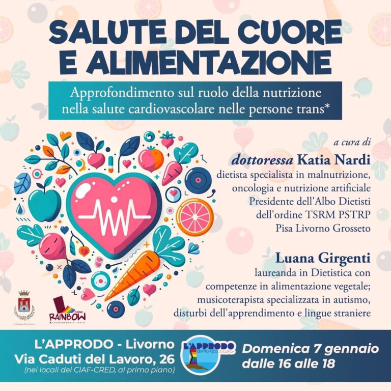 Domenica 7 gennaio, dalle 16 nei locali dell’Approdo Centro Ascolto Lgbtq+, sì svolgerà un evento di approfondimento sul ruolo della nutrizione nella salute cardiovascolare nelle persone trans*.