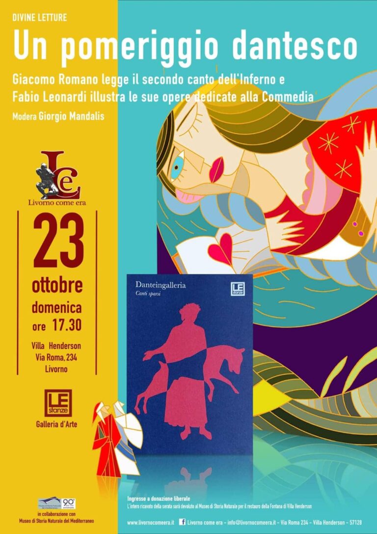 Un pomeriggio dantesco – Domenica 23 ottobre alle ore 17.30 si terrà l’evento- Un pomeriggio dantesco- presso il museo di Storia Naturale di Villa Henderson in via Roma 234 che vede protagonisti Giacomo Romano che leggerà il secondo Canto dell’Inferno e Fabio Leonardi che illustrerà le sue opere dedicate alla Commedia, modera l’incontro Giorgio Mandalis, presidente dell’Associazione Culturale Livorno com’era, promotrice l’evento insieme alla Galleria Le Stanze.