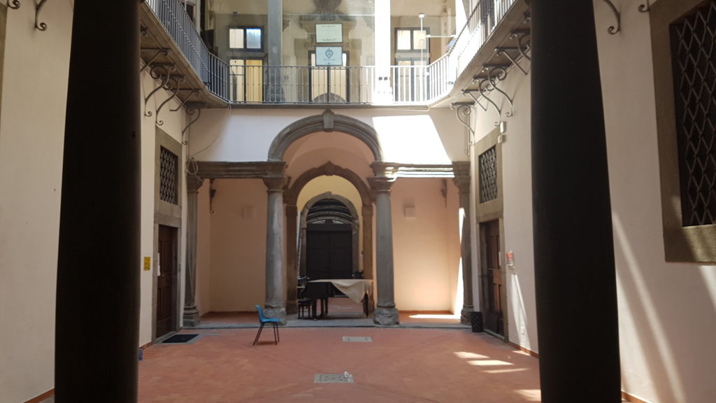 La facciata di Palazzo Huigens si presenta piuttosto sobria con il portone sormontato da un grande balcone situato al piano nobile, mentre il cortile interno, a pianta rettangolare, si evidenzia per il suo aspetto scenografico dove spiccano sui lati più brevi dei loggiati a serliana con archi a sesto ribassato poggianti su pilastri e raccordati con i ballatoi muniti di ringhiera metallica che corrono ai vari piani lungo i lati maggiori. Al piano nobile possiamo inoltre osservare il grande stemma di famiglia in pietra serena. Al pianterreno si apre infine un vastissimo magazzino che si affaccia sul Canale mediceo retrostante. La presenza del grande fondaco non è casuale: l’edificio è stato improntato a criteri di funzionalità così come molti altri fabbricati della Venezia Nuova costruiti o utilizzati da commercianti ed imprenditori delle varie Nazioni presenti nella nostra città. Il palazzo fu innalzato tra la fine del ‘600 ed i primi del ‘700 da Odoardo Brassart, un negoziante originario di Colonia, e quindi ceduto al facoltoso mercante amburghese Antonio Huygens (noto anche per avere finanziato realizzazione della strada che porta alla Valle Benedetta) da cui l’edificio ha quindi preso il nome: abitazione privata del proprietario ed al contempo prestigioso edificio di rappresentanza il palazzo ha ospitato nel 1706 il granduca Cosimo III de’ Medici e la sua corte e nel 1709 Federico IV di Oldenburg, re di Danimarca.