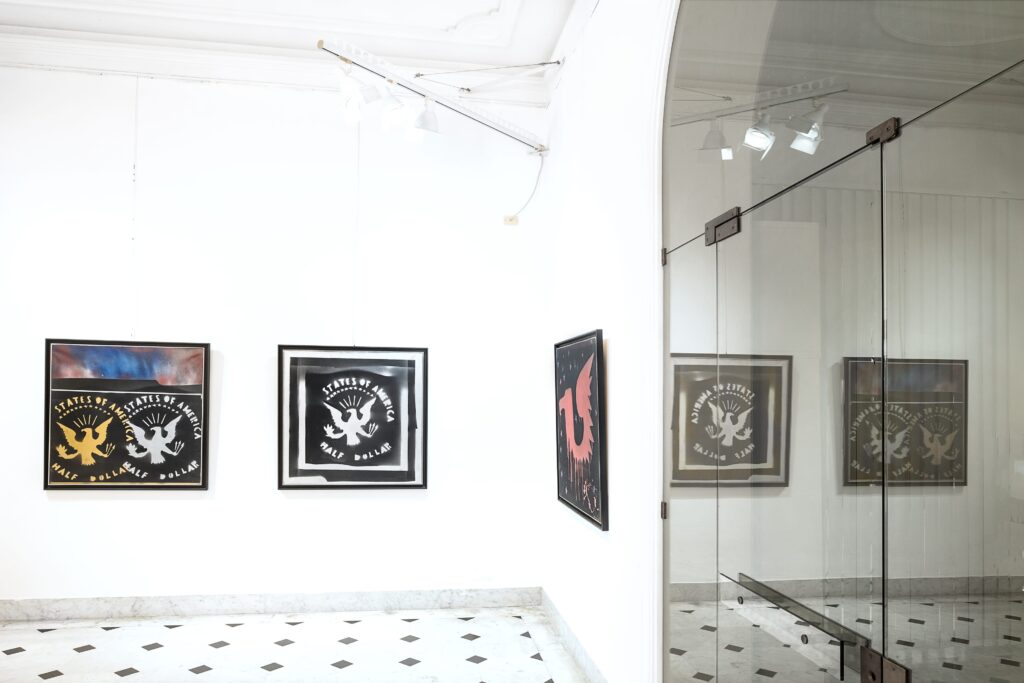 Negli anni ’70 Angeli utilizza ancora questi simboli, propri ormai del suo linguaggio artistico, riproducendoli nei suoi quadri in modo seriale, questi elementi simbolici come ad esempio la moneta, l’ “half dollar” vengono resi un simbolo universale, nonostante siano per sua natura oggetti convenzionali; l’effige dell’aquila, dorata, argentata è un simbolo fortemente legato alla cultura americana e, non a caso, in molte versioni prodotte il rapace si staglia su sfondi dai toni del blu, bianco e rosso, colori che sono un diretto riferimento alla bandiera statunitense.