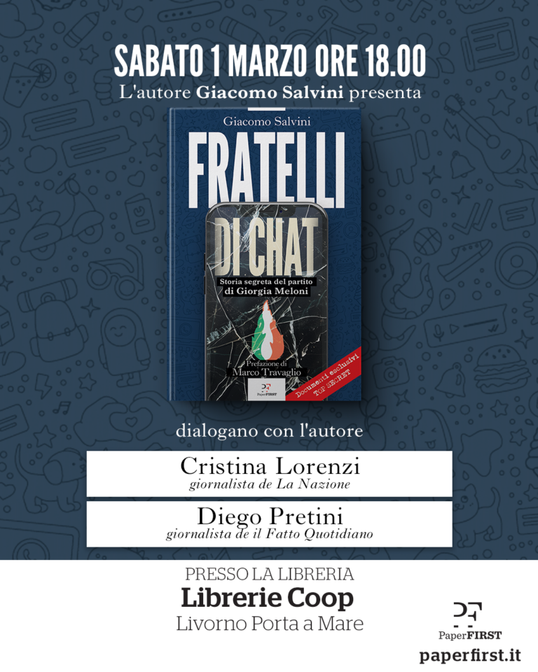 Sabato 1 marzo, alle 18 nella Libreria Coop di Porta a Mare sarà presentato il libro: “Fratelli di chat” di Giacomo Salvini, dialogherà con l’autore Cristina Lorenzi giornalista de La Nazione e Diego Pretini giornalista de Il Fatto Quotidiano. La storia mai raccontata del partito di Giorgia Meloni attraverso le chat dei parlamentari, ministri e dirigenti di Fratelli d’Italia. Dalla guerra a Matteo Salvini al parricidio nei confronti di Silvio Berlusconi fino ai litigi tra compagni di partito a colpi di insulti, tradimenti e “infami” che passano le notizie ai giornali. Ma anche i retroscena inediti sulla caduta di Mario Draghi e la formazione del governo di destra nel 2022, le giravolte sulla guerra in Ucraina e il rapporto con Ursula von Der Leyen e con gli Stati Uniti di Donald Trump.