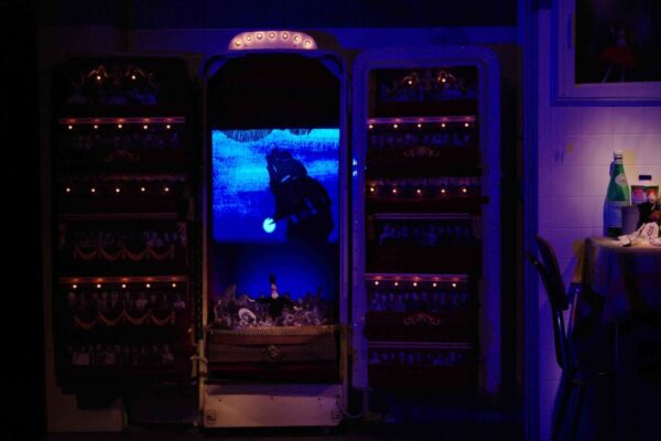 Una storia in cui, in un andirivieni tra realtà e mondo onirico, si perdono le relazioni tra lo spazio e il tempo, e l’elettrodomestico prende vita trasformandosi in un teatro d’opera. Colori, suoni, ombre cinesi e figure di carta esplodono dal frigorifero raccontando e dipingendo la musica in un affresco leggero e brillante, in cui vascelli, sirene e personaggi da fiera si muovono incantati sulle musiche d’opera del Vascello Fantasma di Wagner, della Carmen di Bizet e delle entusiasmanti musiche di Rossini.