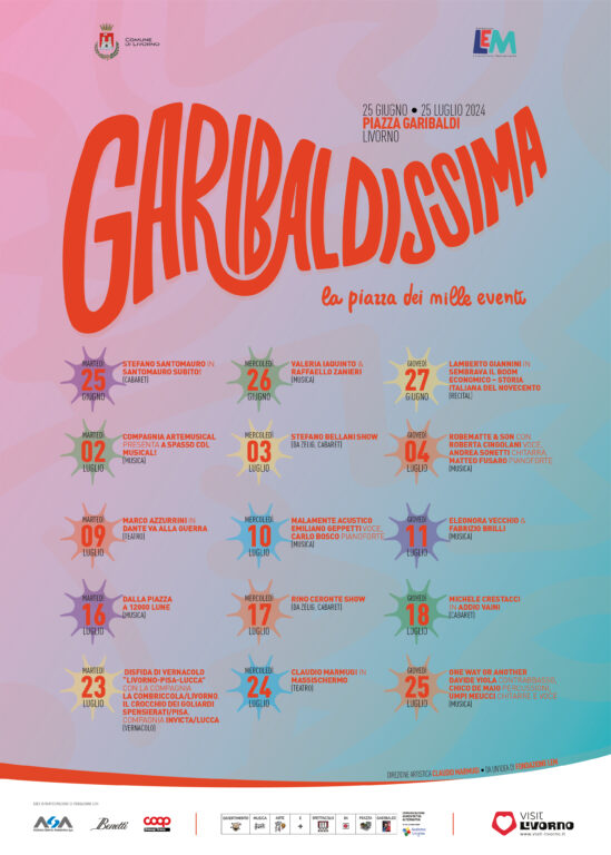 L’inaugurazione, a causa del maltempo, è slittata a mercoledì 26 giugno con una super serata fatta dal cabaret di Santomauro e dalla musica di Iaquinto e Zanieri che animeranno la serata in piazza. La manifestazione è stata presentata da Adriano tramonti, referente organizzazione eventi di Fondazione LEM, Claudio Marmugi, direttore artistico di Garibaldissima e alcuni degli artisti che parteciperanno all’iniziativa. Afferma Adriano Tramonti: “Garibaldissima è un evento pensato prima di tutto per chi vive in Piazza Garibaldi. È uno strumento di socializzazione e attivazione. Per questo, anche se potremmo aumentarlo, teniamo basso il numero di sedie interno al palco: vogliamo che la gente si porti la seduta da casa, proprio come avveniva un tempo e magari si stava a chiacchiera all’aperto. Al di là di questo, anno dopo anno, abbiamo sempre avuto conferma del gradimento dell’iniziativa mantenendo sempre alto il livello artistico della proposta. Una precisa scelta di quest’anno è stata quella di avere il 95% degli artisti provenienti da fuori Livorno”. “Garibaldissima è un’invenzione di Tramonti”, sottolinea Claudio Marmugi, “un’idea che ha preso forma in pieno covid con ben 21 eventi realizzati in piazza Garibaldi: l’edizione più ricca di date. All’inizio eravamo scettici sulla partecipazione di pubblico. Ora, dopo quattro anni e grazie al lavoro che abbiamo svolto, possiamo dire di poter essere tranquilli sul risultato della manifestazione 2024 in termini di partecipazione. La durata degli spettacoli non supererà mai i sessanta minuti canonici per la piazza”. La rassegna mantiene la freschezza di sempre. Una piccola piazza popolare, uno scrigno nel cuore di Livorno come piazza Garibaldi, con le sue storie e la sua Storia, che torna a vivere, a pulsare di luce propria e a riempirsi di spettacolo, in una vera e propria esplosione di note, risate, applausi, colore e folklore con un cartellone di qualità.