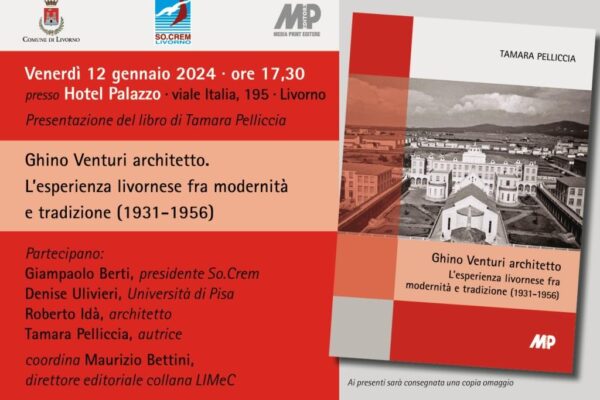 Venerdì 12 gennaio alle 17,30 nei locali del Grand Hotel Palazzo – viale Italia, 195 sarà presentato il libro di Tamara Pelliccia “Ghino Venturi architetto. L’esperienza livornese tra modernità e tradizione (1931-1956)”. A questa iniziativa promossa dalla So.Crem, con il patrocinio del Comune parteciperanno Tamara Pelliccia, autrice, Giampaolo Berti, presidente So.Crem, Denise Ulivieri, Università di Pisa, Roberto Idà, architetto Maurizio Bettini, direttore editoriale della collana LIMeC (Livorno Moderna e Contemporanea nel ruolo di coordinatore.
