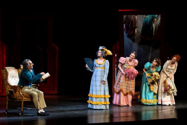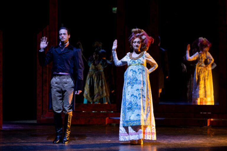 Tutta la storia si gioca fra balli e scambi di sguardi, fra visite di cortesie e scortesi e pungenti pettegolezzi, fra confronti impietosi e miraggi sponsali. Il regista ha asciugato il romanzo e ha privilegiato la storia di due delle cinque sorelle. Da una parte c’è Jane innamorata del bel Charles e dall’altra c’è Elizabeth, spigolosa e determinata che va in cerca dell’amore vero e, anche quando sembra averlo trovato, lo mette alla prova. Orgoglio e pregiudizio di Arturo Cirillo – prodotto da Marche Teatro – conferma la maturità di un regista e attore che sa restituire al pubblico la semantica del teatro di tradizione, ma concedendosi di non affidarsi alla sola rappresentazione, ma di voler spalancare l’azione a un pensiero che indaga l’insostenibile leggerezza delle relazioni amorose e familiari.