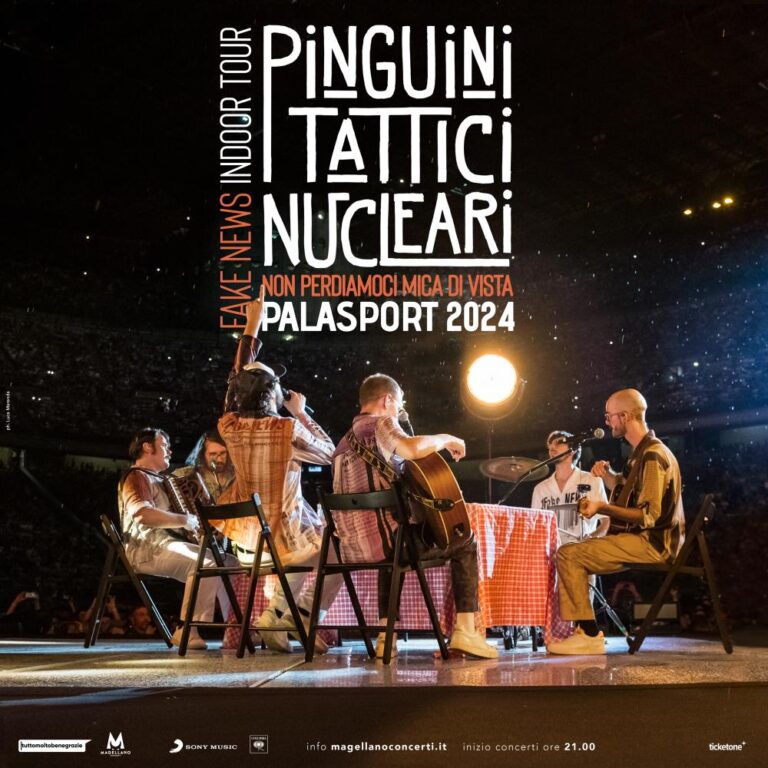 Finita la prima parte del tour estivo, che si è conclusa sabato scorso, 9 settembre, alla RCF Arena di Reggio Emilia (Campovolo) con una grande festa insieme a 80.000 persone, e a fronte di una grande richiesta, i Pinguini Tattici Nucelari annunciano le nuove date che porteranno nei palazzetti Fake News, disco uscito lo scorso dicembre e già certificato Triplo Platino. Il “Non perdiamoci mica di vista / Fake News Indoor Tour – Palasport 2024”, organizzato e prodotto da Magellano Concerti, vedrà la band sui palchi dei più importanti palasport italiani nella primavera del 2024. I Pinguini Tattici Nucleari faranno tappa a Livorno, a cura di LEG Live Emotion Group, il 29 e 30 aprile 2024 al Modigliani Forum. Continua così, in una versione più intima e confidenziale, il tour che quest’estate ha portato il gruppo a incontrare fan di ogni età, da nord a sud fino alle isole. Dopo la calorosa accoglienza che il pubblico ha riservato alla band, Riccardo, Elio, Nicola, Simone, Matteo e Lorenzo decidono di tornare ad abbracciare il proprio pubblico nei palasport per continuare a raccontare la storia di una giovane band che negli anni ha saputo alternare grandi hit a brani cantautorali, capaci di far sorridere e di far pensare. Prevendite già attive sui circuiti Ticketone.
