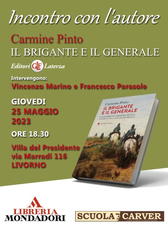 “Il brigante e il generale” sarà presentato, alla presenza dell’autore Carmine Pinto, giovedì 25 maggio, alle 18,30, alla “Villa del Presidente” in via Marradi 116 a Livorno. Interverranno Vincenzo Marino e Francesco Parasole.