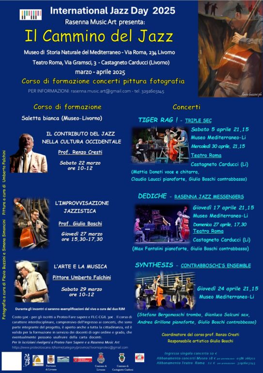 Presentato presso l’Auditorium del Museo di storia naturale del Mediterraneo il progetto musicale a cura dell’Associazione Rasenna Music Art Il Cammino del Jazz, articolato su una serie di conferenze, concerti, pittura e fotografia che si terranno a Livorno e a Castagneto Carducci, nei mesi di marzo e aprile. Presenti alla conferenza stampa il musicologo Renzo Cresti, il musicista Giulio Boschi e il pittore Umberto Falchini,