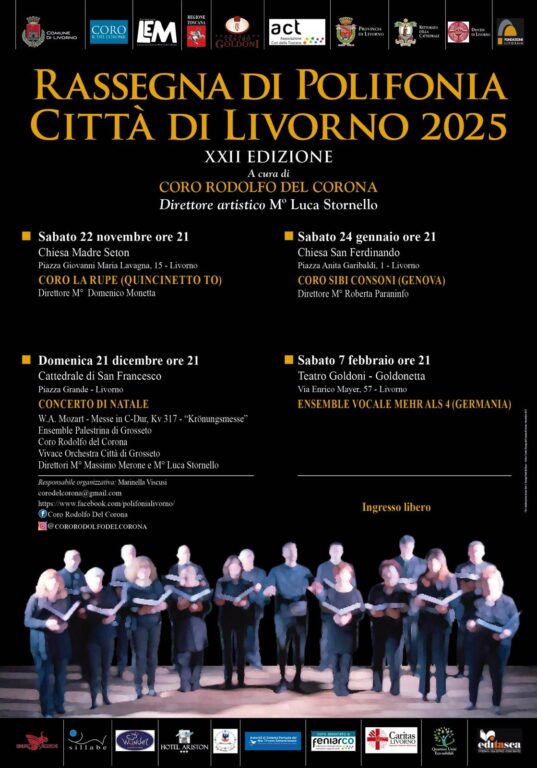 E’ ai nastri di partenza la nuova edizione della Rassegna di polifonia “Ciità di Livorno”, manifestazione organizzata dal Coro “R. Del Corona” in compartecipazione con il Comune di Livorno e con la direzione artistica del M° Luca Stornello. Quest’anno la manifestazione raggiunge la sua ventiduesima edizione: un traguardo di non poco conto, segno di un impegno continuativo e tenace in favore della diffusione della cultura polifonica di qualità, premiato negli anni da un pubblico sempre crescente e dall’interesse di istituzioni pubbliche e private.