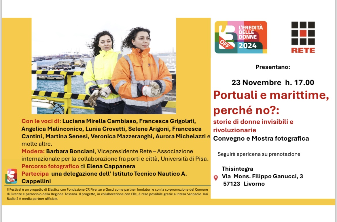 la relazione fra porti e città RETE è inserito all’interno della VII edizione del Festival nazionale “L’eredità delle donne”, promosso da Elle con la direzione artistica di Serena Dandini che nei giorni 22/23/24 novembre accoglierà eventi in tutta Italia sull’empowerment femminile, con la volontà di raccontare la contemporaneità attraverso le sue protagoniste, per riscoprire il ruolo che le donne hanno avuto e continuano ad avere nei diversi campi del sapere e della società, e contribuire così al progresso e all’eredità da lasciare alle generazioni future. Livorno ospiterà un unico evento nell’ambito del festival dedicato all’empowerment femminile in ambito portuale e marittimo. Barbara Bonciani: “Come vicepresidente RETE Italia sono molto orgogliosa che Livorno ospiti una giornata del Festival nazionale dedicata alle lavoratrici portuali e marittime. Si tratta di due settori nati storicamente maschili che da pochi anni stanno vivendo una trasformazione importante. Le donne, in questi ambiti di lavoro stanno sfidando stereotipi e pregiudizi di genere ed emergendo per il loro indispensabile contributo, portando nuovi modelli di visione, di leadership e di gestione del lavoro che si aggiungono a quelli maschili. È importante far conoscere la loro storia, il loro valore anche per avvicinare le generazioni future a questi mestieri e farlo attraverso le loro voci”.