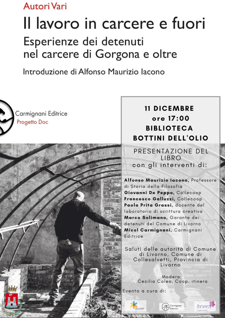 Sarà presentato domenica 11 dicembre, alle 17 nei locali della Biblioteca dei Bottini dell’Olio in piazza del Luogo Pio, il libro: “Il lavoro in carcere e fuori – esperienze dei detenuti nel carcere di Gorgona e oltre” edito da Carmignani Editrice. Interverranno all’evento: Alfonso Maurizio Iacono – Professore di Storia della Filosofia, Micol Carmignani – Carmignani Editrice, Giovanni De Peppo – ColleCoop, Francesco Galluzzi – ColleCoop Paola Prita Grassi – docente del laboratorio di scrittura creativa, Marco Solimano – Garante dei detenuti del Comune di Livorno. A moderare l’evento sarà Cecilia Caleo – Coop. Itinera. Il libro è un’opera collettiva sulla tematica del lavoro attraverso i racconti di: Marco, Domenico, Daniele Durante, Singh Kulbir, Daniele Bergero, Luigi Langella, Arabi Salah, Muhammad Amir, Valerio, Arthur, Emilio, Armando, Tip.