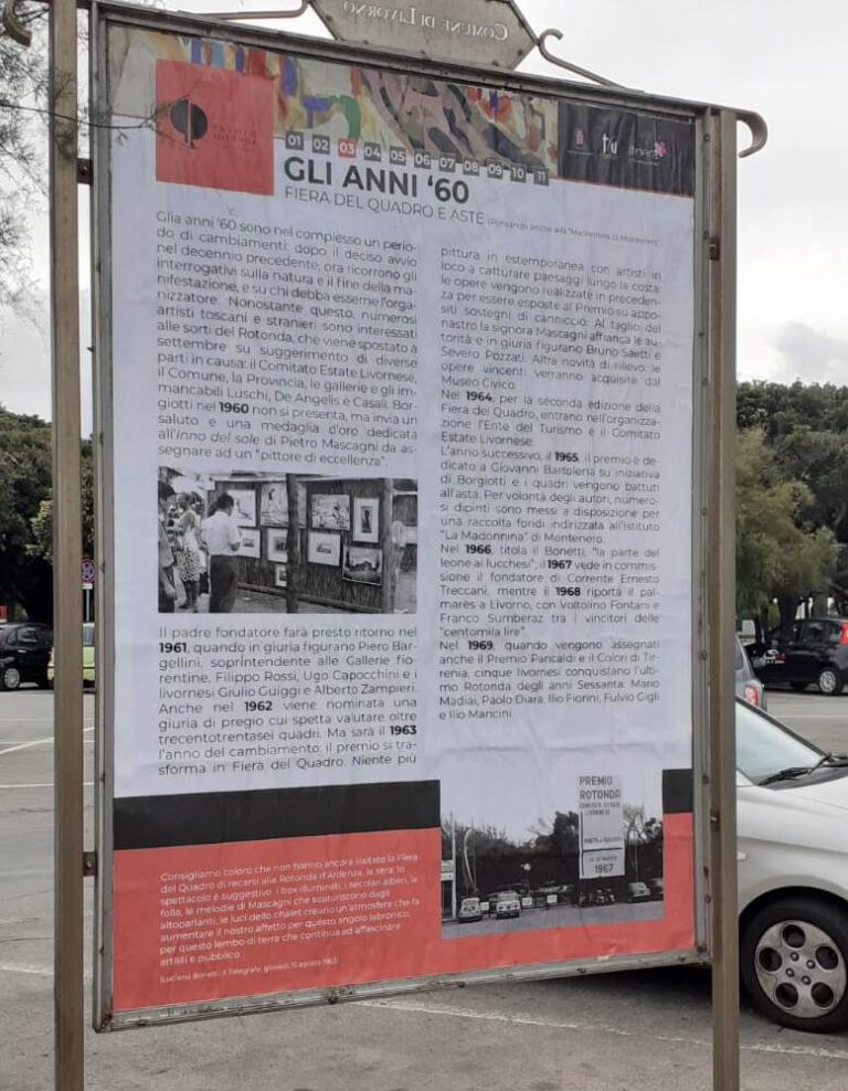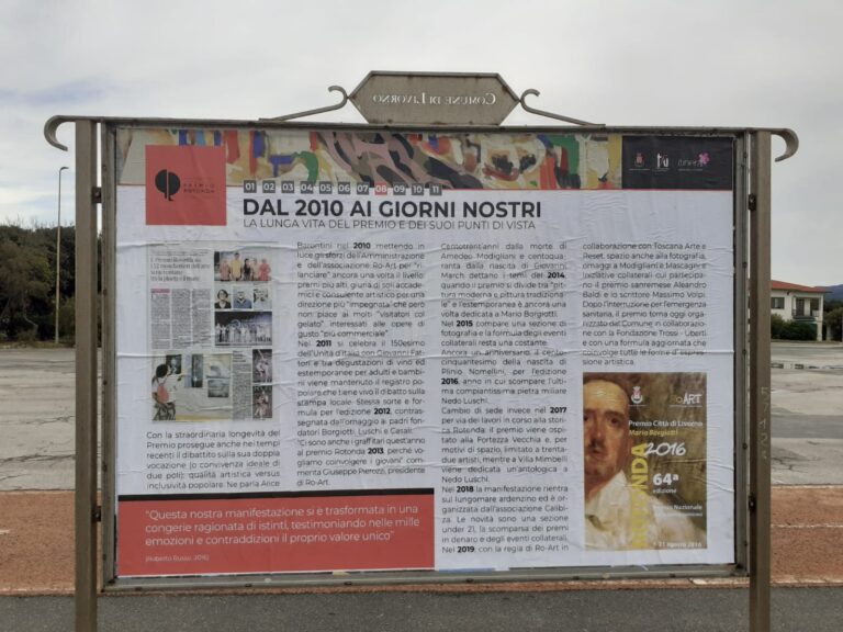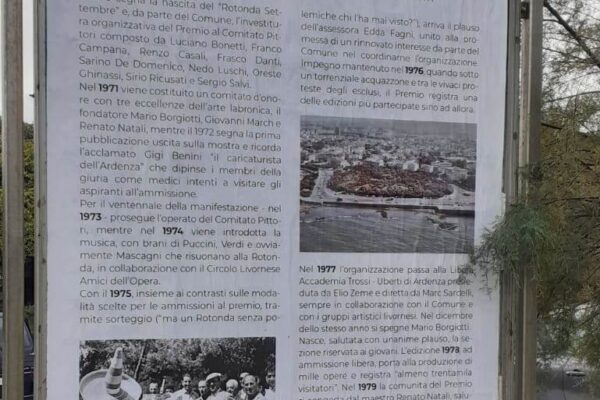 Da venerdì 30 settembre a sabato 15 ottobre, inoltre, un tratto del lungomare labronico sarà animato dall’itinerario denominato “Il Lungomare delle Arti. Dal passeggio al Premio Rotonda di Mario Borgiotti”, a cura di Coop Itinera. L’itinerario partirà dal cancello di Villa Trossi, proseguirà poi dall’altezza della Baracchina Rossa e accompagnerà la passeggiata pedonale fino alla Rotonda, con dodici affissioni di manifesti rappresentanti altrettante tappe storiche del Premio Rotonda. Per l’occasione, sarà possibile effettuare due passeggiate con guida, domenica 2 ottobre alle 11:00 e domenica 9 ottobre alle 15:30 con ritrovo davanti al cancello di Villa Trossi (in via Ravizza 76).
