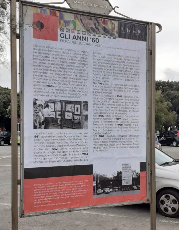 Dalla Baracchina Rossa fino alla celebre Rotonda che ha visto tanti artisti passare con cavalletto e colori sottobraccio tra una libecciata, qualche baruffa e molti aneddoti coloriti, un viaggio nel tempo scandito in dodici manifesti racconta le fasi storiche di una manifestazione che, prima di tutto, restituisce l’inconfondibile cifra identitaria di Livorno. Una passione per l’arte, diffusa e costante, che difficilmente trova analogie in altre città.