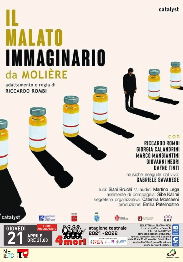 Giovedì 21 aprile alle 21 sul palcoscenico del Teatro 4 Mori di Livorno andrà in scena “Il Malato Immaginario” da Moliere, adattamento e regia di Riccardo Rombi. Lo spettacolo porterà in scena lo stesso Riccardo Rombi che reciterà assieme a Giorgia Calandrini, Marco Mangiantini, Giovanni Negri, Dafne Tinti. Le musiche saranno eseguite dal vivo da Gabriele Savarese. Luci: Siani Bruchi. Audio: Martino Lega. Assistente di compagnia: Sibe Kallmi, segreteria organizzativa Caterina Moscherini. Produzione: Emilia Paternostro.