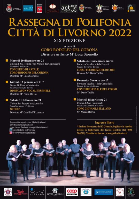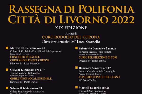 Ai nastri di partenza la XIX edizione della Rassegna di Polifonia Città di Livorno che quest’anno si svilupperà nell’arco di 5 mesi, tra dicembre 2022 ed aprile 2023, alzando ancora l’asticella della qualità. La stagione di eventi polifonici, organizzata dall’Associazione Coro Rodolfo Del Corona APS in compartecipazione col Comune di Livorno e con la direzione artistica del M° Luca Stornello, diviene ormai un appuntamento fisso nel panorama cittadino, ricevendo il riconoscimento di una lunga lista di enti, associazioni e soggetti privati.
