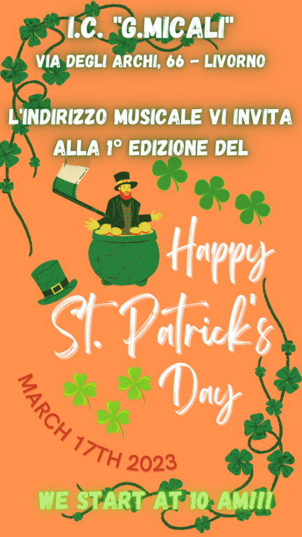 La mattina di venerdì 17 marzo, dalle ore 10 alle 13, presso la scuola secondaria di primo grado dell’I.C. “G. Micali”, si festeggerà per la prima volta il “St. Patrick’s Day”, ovvero la giornata di San Patrizio patrono d’Irlanda. L’istituzione scolastica secondaria di primo grado è una scuola ad indirizzo musicale, un percorso di studio triennale volto alla conoscenza e allo studio degli strumenti musicali quali chitarra, violino, violoncello e clarinetto.