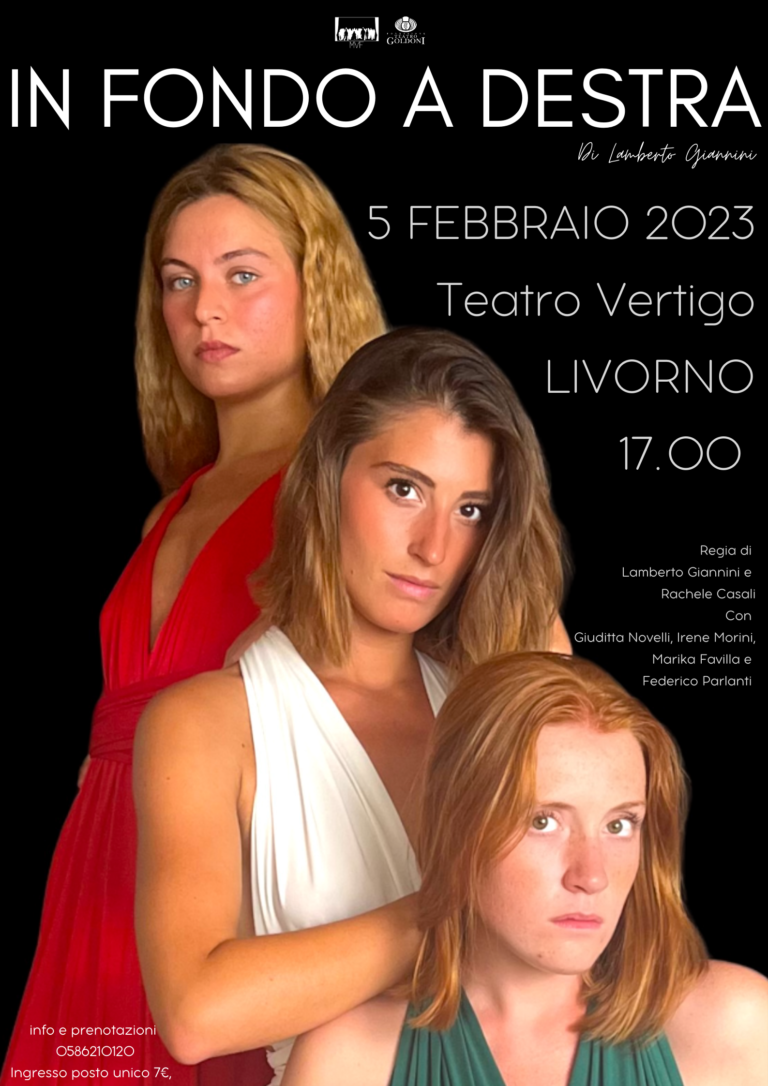 Dove si trova il bagno? Dov’è finita l’Italia, a partire dal connubio Cavour Rattazzi? Proprio… in fondo a destra! È esattamente da questa associazione di idee che è nato “In fondo a destra”, uno spettacolo diretto da Lamberto Giannini e Rachele Casali, e che vede in scena le tre attrici Marika Favilla, Irene Morini, e Giuditta Novelli (con incursioni di Federico Parlanti).