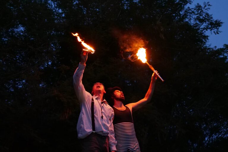 Un’entrata calorosa a suon di applausi, bambini che si improvvisano mirabolanti giocolieri, illusioni che fino all’ultimo non sapremo se riusciranno, monocicli, palline, clave… E poi via, verso il gran finale di fuoco! Con lo sgraziato intento di riprodurre un’atmosfera a cavallo tra i salotti della Londra vittoriana e le piste dei circhi girovaghi, diavolerie, sobrietà e follia si avvicendano dando vita allo spettacolo… ma la poesia, quella ce la mette tutta il pubblico.