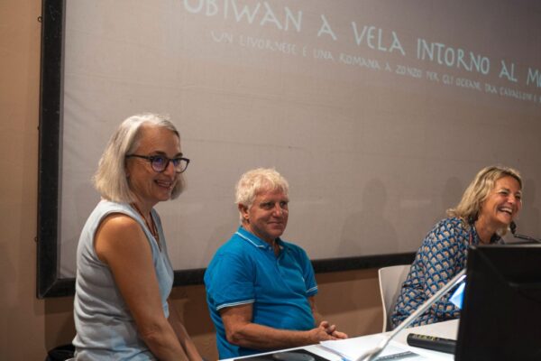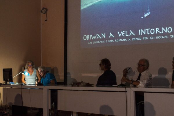 Obiwan a vela intorno a mondo – Un livornese e una romana a zonzo per gli oceani, tra cavalloni e bonacce”. Dopo i saluti dell’Assessora Barbara Bonciani e del Dirigente dell’Autorità portuale Andrea Del Corona, ha preso la parola il presidente del Circolo Velico Livorno Giuseppe Guarneri. Il presidente ha sottolineato come, in quella sala, fossero in quel momento riunite due importanti realtà della vela livornese. Infatti insieme a Giovanni Viviani e Raffaella Marozzini, protagonisti di un avventuroso viaggio intorno al mondo in barca a vela, erano presenti anche Leonardo Fonti e Filippo Buti, equipaggio livornese vincitore della ultima edizione della prestigiosa regata PalermoMontecarlo a bordo della loro imbarcazione “Ultravox Seares”. Il microfono è poi passato a Giovanni e Raffaella che hanno intrattenuto il pubblico con una alternanza di immagini , filmati e gustosi racconƟ di vita vissuta in viaggio. Oltre alle loro avventure di navigazione tra vento e onde, Giovanni e Raffaella hanno parlato del rapporto di amicizia instaurato con le popolazioni locali nelle diverse tappe del viaggio e della complicità e aiuto ricevuto e dato alle numerose imbarcazioni di tutte le nazionalità con cui hanno condiviso varie tappe di navigazione. Giovanni e Raffaella, livornese lui e romana lei, sono partiti per il giro del mondo sulla loro barca a vela “Obiwan”. Una storia cominciata 8 anni fa e che li ha visti attraversare due oceani, percorrere più di 20.000 miglia visitando i Caraibi, Panama, le Galapagos, la Polinesia Francese, le isole Cook, Tonga, Figi, la Nuova Caledonia, l’Australia, la Papua Nuova Guinea, le Isole Solomon e l’Indonesia. Veri protagonisti della serata sono stati i video e le foto montati in una accurata presentazione in cui per ogni zona veniva illustrata la rotta con una cartina interattiva. Ogni filmato era accompagnato da una musica epica della zona e commentato in diretta da Giovanni e Raffaella, che si alternavano al microfono per spiegare, commentare e raccontare. Dall’esperienza del giro del monto è nato un libro “Scalza, spettinata, abbronzata – il giro del mondo a vela su Obiwan” edito da Perrone e ora disponibile anche in ebook. A rendere ancora più emozionante e coinvolgente la serata ha contribuito l’attore Fabrizio Brandi che ha non solo letto, ma interpretato alcuni brani del libro. I protagonisti sono riusciti a incantare il pubblico con immagini di paesaggi incredibili, scene di vita di culture lontane e sconosciute e la loro passione per la vela e per il viaggio, tanto che si stà già organizzando una seconda.