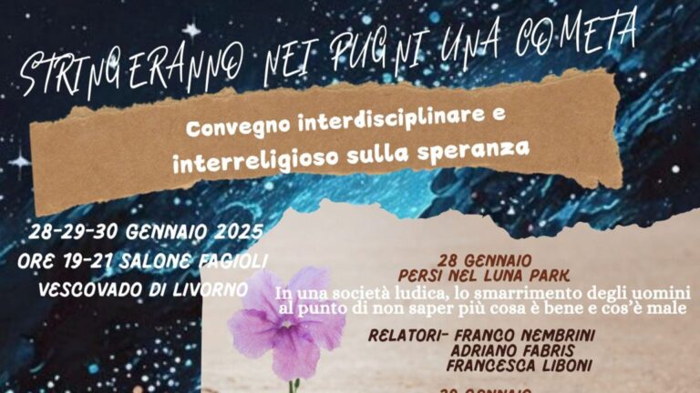 “Stringeranno nei pugni una cometa” è questo il titolo del convegno interdisciplinare e interreligioso che si svolgerà nel salone del vescovado il 28 29 e 30 gennaio. 3 giorni dedicati alla speranza nello spirito del Giubileo, che vedranno relatori provenienti da varie università d’Italia per trattare il tema secondo diverse prospettive. Nella prima giornata un’analisi della situazione attuale, il secondo giorno un approfondimento sui progressi delle neuroscienze ed infine l’ultima giornata l’aspetto escatologico del tema e come le diverse religioni interpretano l’aldilà. Il convegno potrà essere seguito in presenza e online. Infatti sarà trasmesso in diretta streaming sul canale youtube della Diocesi dalle 19 alle 21 e nella prima ora, dalle 19 alle 20 anche su Granducato tv, sarà infatti una puntata speciale di Si fa sera… parliamone, la trasmissione in onda ogni martedì sera su Granducato TV.