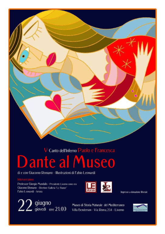 Il primo appuntamento estivo, per il ciclo “Incontri danteschi al Museo di Storia Naturale”, a cura di Associazione “Livorno com’era” in collaborazione con Galleria Le Stanze, avrà come argomento “Il canto di Francesca”. Gli incontri, dedicati ai tre canti dell’Inferno, tra i più famosi della Commedia, avranno come protagonisti altrettanti personaggi resi immortali dalla poesia dell’Alighieri: Francesca, Farinata e Ugolino. Giacomo Romano, direttore della Galleria d’Arte “Le Stanze”, reciterà “Il canto di Francesca” tratto dalla Divina Commedia, mentre a Giorgio Mandalis, presidente dell’Associazione Livorno com’era, sarà affidata l’introduzione del canto. Giacomo Romano ha frequentato i corsi amatoriali organizzati dalla scuola teatrale “Il Grattacielo”. Le suggestive immagini che accompagnano la serata sono opera di Fabio Leonardi, pittore ed illustratore. L’appuntamento, è quindi, per giovedì 22 giugno alle 21 al Museo di Storia Naturale del Mediterraneo in via Roma 234. Non mancate! Ingresso a donazione liberale. Prenotazione consigliata.