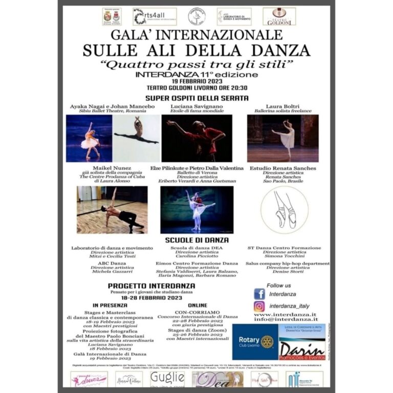 L’11° edizione di Interdanza, progetto didattico-culturale rivolto a tutti gli allievi dagli 8 anni in su che studiano danza – organizzato dall’associazione culturale arts4all con la collaborazione del Laboratorio di danza e movimento – si svolgerà sia in presenza che online, dal 18 al 28 febbraio 2023 con stages, il concorso internazionale “Con – Corriamo” e la masterclass con Luciana Savignano.