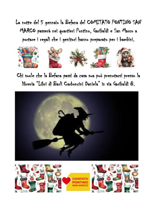 La notte del 5 gennaio si rinnova una tradizione molto amata dai più piccoli. La Befana del Comitato Pontino San Marco attraverserà i quartieri Pontino, Garibaldi e San Marco per consegnare i regali preparati con cura dai genitori per i propri bambini. Un momento di magia e di festa che coinvolge tutta la comunità, riportando nelle strade l’atmosfera dell’Epifania e il sorriso dei più piccoli, che potranno vivere l’emozione della visita della Befana direttamente a casa propria. Chi desidera partecipare all’iniziativa e far passare la Befana nella propria abitazione può prenotarsi alla libreria “Libri di Barlì Carboncini Daniela”, situata in via Garibaldi 8. L’iniziativa è promossa dal Comitato Pontino San Marco, da sempre impegnato nell’organizzazione di eventi capaci di valorizzare il territorio e rafforzare il senso di comunità, soprattutto attraverso attività dedicate ai bambini e alle famiglie.
