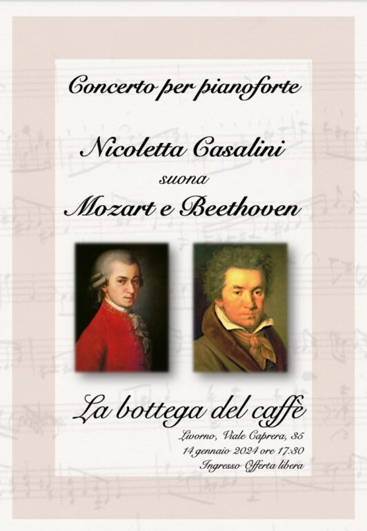 Sono circa 20 anni che l’Associazione Lavoratori Comunali, oggi ALC-APS, nella sua sede “Bottega del Caffè”, opera costantemente come promotore culturale, ospitando sotto gli archi del salone seicentesco, eventi di natura varia quali: esposizioni artistiche, dibattiti, presentazioni di libri, concerti e conferenze, quest’anno grazie al riconoscimento operato dal CESVOT (Centro Servizi Volontariato Toscana) aumenterà l’offerta culturale che la “Bottega”, potrà offrire alla città. Il primo esempio di questo riconoscimento sarà un recital pianistico incentrato sulla produzione di Wolfgang Amadeus Mozart e Ludwig Van Beethoven. A guidarci in questo incontro con questi due grandissimi pilastri della musica strumentale occidentale, sarà la Professoressa Nicoletta Casalini, classe 1963, diplomata presso l’Istituto Superiore di studi musicali “Pietro Mascagni” (oggi Conservatorio) nel 1984 nella classe della Professoressa Liana Gragnani de Botton. Successivamente si è classificata 1^ alla “Coppa Pianistica Città di Osimo” nel 1979, ha ottenuto nel 1985 il Diploma di merito al Concorso Pianistico Città di Albenga”, nel 1986 ha ottenuto il primo Premio al “Concorso Nazionale Giovani Musicisti Gargano”, nel 1986 è 3a classificata al “Concorso Nazionale Pianistico A.M.A. Calabria”, nel 1987 è 2a classificata al “Concorso Pianistico Città di Roma Agorà 80” premio Marcella Crudeli. Ha seguito un corso di perfezionamento con il M° Antonio Bacchelli, nostro compianto concittadino, e successivamente con il M° Alessandro Specchi. Si è esibita in vari concerti e contemporaneamente ha svolto attività didattica come insegnante di musica presso varie scuole medie in Toscana. Un curriculum, come si legge, di tutto rispetto, Domenica 14 gennaio alle ore 17,30 la Professoressa Casalini affronterà un concerto solistico con il seguente programma : Sonata n. 3 in si bemolle maggiore, K 281 (1774) e Sonata n. 4 in mi bemolle maggiore, K 282 (1774) entrambe di W. A. Mozart (1756 – 1791), mentre di L. V. Beethoven verrà eseguita la Sonata n. 1 in fa minore, op. 2 n. 1 (1793 – 1795) e la Sonata per pianoforte n. 19 in sol minore, op. 49 n. 1 (1798). Un programma di notevole contenuto che ricordiamo avrà luogo domenica 14 gennaio alle 17,30, presso la “Bottega del Caffè”, viale Caprera, 35, con ingresso a libera offerta. La cittadinanza è invitata.