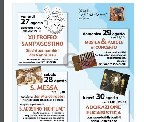 Serata in concerto con musica sacra e letture meditate, domenica 29 agosto alle 21:15, presso la chiesa di Sant’Agostino, per festeggiare la ricorrenza del Santo patrono: in programma, riflessioni su alcuni scritti filosofici e teologici della produzione di Sant’Agostino, commentati musicalmente da brani inediti per archi, fiati, coro e continuo, composti per l’occasione ed eseguiti all’organo da Sandro Mecarelli, al flauto traverso da Simone Barbieri, al violino da Chiara Caturegli, al violoncello da Anna Nosiglia e con la partecipazione del soprano Generosa Cicchetti, del mezzosoprano Rosalba Fazzi e del Coro parrocchiale di Sant’Agostino.