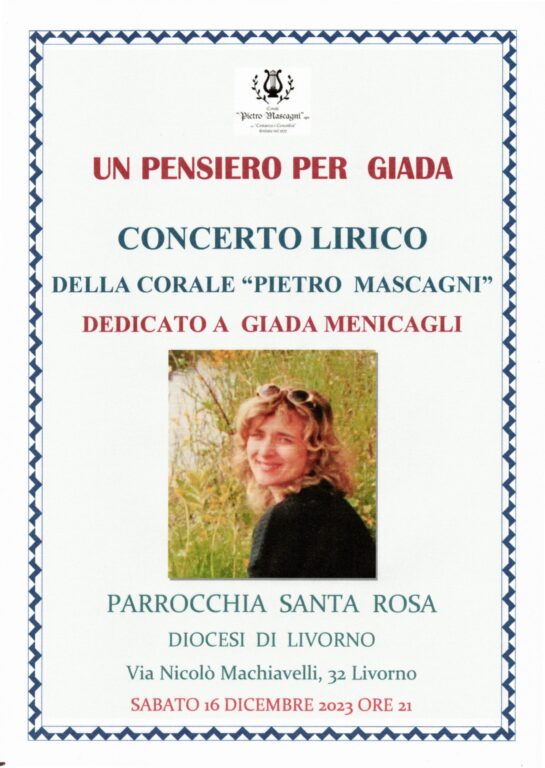 Giada Menicagli era una giovane donna, che nel 2003, a soli 29 anni ha lasciato questa vita. Sono passati 20 anni da quel triste giorno, pur pieno della speranza della rinascita in Cristo. La memoria è la nostra arma per sconfiggere lo scorrere del tempo e di motivi di ricordarla Giada ne ha lasciati molti, moltissimi motivi perché le sue tante qualità non sono scomparse con lei. Nata nel 1974 , trovò giovanissima il desiderio di portare la testimonianza della sua Fede in Gesù Cristo a quanti riuscì a raggiungere nella sua pur breve vita terrena. Basta guardare la dolcezza del suo sguardo nella foto inserita nel manifesto, per capire quanta pace albergava nei suoi occhi, pace che offriva ai bambini con la sua opera di catechista e ai grandi con la costante testimonianza della sua fede. La Corale Mascagni, sensibile a gesti di solidarietà e sostegno, è entrata in punta di piedi in questo ricordo a venti anni dalla scomparsa, e come suo costume ha voluto organizzare un concerto composto da musiche sacre e liriche, che saranno intercalate da testimonianze e pensieri in ricordo di Giada. Giorgio Maroni guiderà ed accompagnerà alla tastiera la Corale Mascagni, impegnata nell’esecuzione di pagine musicali senza tempo, saranno eseguiti l’Ave Verum di Mozart, il Panis Angelicus di Frank, l’Ave Maria sull’intermezzo da Cavalleria Rusticana di Mascagni, passando al Va Pensiero dal Nabucco di Verdi e dalla preghiera “O Signore dal Tetto natio” Da i Lombardi, sempre di Verdi, ci sarà spazio per la grande preghiera dal Mosè “Dal Tuo stellato soglio” per coro e soli. Fanno parte della Corale i tre solisti : il Soprano Marianna Pace, il Baritono Luigi Luisi ed il Basso Paolo Morelli. Al Soprano sarà affidata l’Ave Maria di Bach – Gounod ed al Basso il Benedictus dalla Messa di Gloria di Pietro Mascagni. Il programma proseguirà con brani legati alla tradizione natalizia, il Noel di Adam, l’Adeste Fideles di Wade, il tradizionale Gli Angeli dalle campagne, per finire con Tu scendi dalle stelle di Sant’Alfonso dei Liguori. La cittadinanza è invitata quindi sabato 16 dicembre alle ore 21 presso la Chiesa di Santa Rosa in Via Machiavelli, con ingresso libero.