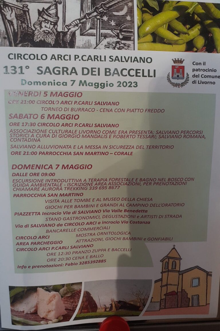 L’assessore al commercio Rocco Garufo, nella conferenza stampa di presentazione dell’edizione 2022, disse: “Lavoreremo per riportare la Sagra in via di Salviano il prossimo anno”. Detto, fatto. Quest’anno la Sagra dei Baccelli edizione 131 che si svolgerà il 7 maggio, cioè come di consueto la prima domenica del mese di maggio, torna (dopo 8 anni, l’ultima volta nel 2014) in via di Salviano: “Via di Salviano è il luogo naturale – spiega uno degli organizzatori Fabio Altini, presidente del circolo Arci Carli Salviano – il ritorno in questa via è perciò una soddisfazione enorme. Ringrazio per questo il sindaco e l’assessore Garufo”. Il ponte sul Rio Maggiore non sarà pronto per il 7 maggio e quindi si potrà attraversare la Sagra attraverso il ponte pedonale che costeggia via di Salviano: “Lato via della Chiesa i livornesi troveranno le attività gastronomiche e nella via della Chiesa stessa ci saranno gli stand delle associazioni di volontariato. Sarà inoltre possibile effettuare visite guidate all’interno della Pieve perché non dimentichiamocelo la Sagra per sua natura ha una connotazione religiosa, è una festa di ringraziamento religioso. Lato via Costanza troveranno invece collocazione le bancarelle commerciali”. Venerdì 5 maggio torneo di burraco al circolo; sabato 6 maggio la giornata sarà animata da attività collaterali culturali al circolo e alla sera dalla esibizione di una corale all’interno della Pieve; domenica 7 maggio spazio alla Sagra, appunto, con stand bancarelle e giochi per bambini nell’area parcheggio davanti al circolo, esibizione di hip pop e cena con ballo.