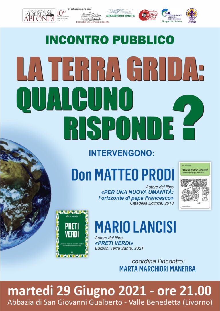 Il nostro pianeta sta soffrendo, e ormai in molti ne hanno preso consapevolezza. Ma ancora in pochi stanno adeguando i propri comportamenti affinché la nostra terra possa avere un futuro bello e stabile. Papa Francesco ha indicato “la sfida urgente di proteggere la nostra casa comune unendo tutta la famiglia umana nella ricerca di uno sviluppo sostenibile e integrale, poiché sappiamo che le cose possono cambiare”. Tutte le Chiese cristiane sono impegnate in questa direzione, e nelle varie parti del mondo i giovani stanno prendendo consapevolezza che questo tema li riguarda da vicino e si stanno impegnando in prima persona. Si parlerà di questo argomento con due autori che hanno recentemente rivolto la loro attenzione al tema: don Matteo Prodi, sacerdote bolognese, attualmente responsabile della Scuola di Impegno socio-politico della Diocesi di Cerreto Sannita in Campania, e autore del libro “Per una nuova umanità: l’orizzonte di Papa Francesco”; Mario Lancisi, giornalista, che ha recentemente pubblicato un libro-intervista ad alcuni sacerdoti che, nelle varie parti d’Italia, si spendono per la cura dell’ambiente (“Preti verdi”). L’incontro, organizzato dall’Associazione Alberto Ablondi in collaborazione con la Parrocchia e l’Associazione della Valle Benedetta, con l’Associazione Amici del Quilici, il Segretariato delle attività ecumeniche e l’associazione scout Agesci, si svolgerà martedì 29 giugno alle 21 nella Chiesa di San Giovanni Gualberto alla Valle Benedetta a Livorno. A moderare l’incontro sarà Marta Marchiori Manerba, giovane capo scout, appassionata di questi temi.