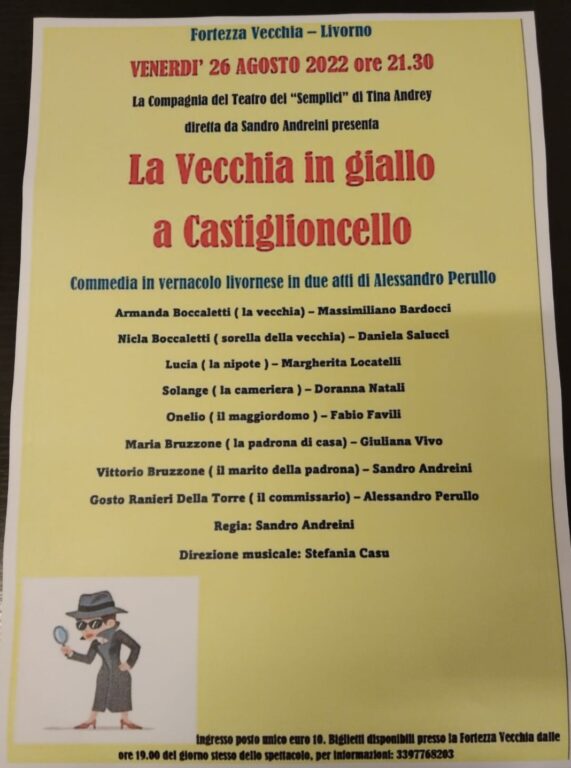 La vecchia in giallo a Castiglioncello” è una commedia in livornese più che in vernacolo livornese di Alessandro Perullo con la regia di Sandro Andreini che la compagnia del teatro dei “Semplici” di Tina Andrey metterà in scena venerdì 26 agosto alle 21,30 sul palcoscenico della Fortezza Vecchia. In questa commedia si parla il linguaggio corrente di tutti i giorni e si svolge ai tempi di oggi. Unica eccezione è riservata alle due protagoniste anziane quali la vecchia Armanda, interpretata dall’unica maschera Massimiliano Bardocci, e sua sorella Nicla interpretata da Daniela Salucci che in alcuni momenti adoperano il linguaggio tipico del vernacolo livornese. I personaggi, oltre alle due anziane donne che per 50 anni hanno condotto un barroccino di frutta e verdura in Piazza Cavallotti , sono una coppia di coniugi (Sandro Andreini e Giuliana Vivo) proprietari della villa a Castiglioncello dove si svolge l’azione, una ragazza giovane (Margherita Locatelli)  nipote delle due anziane fidanzata col figlio dei proprietari della villa, una cameriera (Doranna Natali) un po’ particolare , un maggiordomo  classico (Fabio Favilli) e un commissario di polizia (Alessandro Perullo) molto strano  per come conduce le indagini perché pisano.